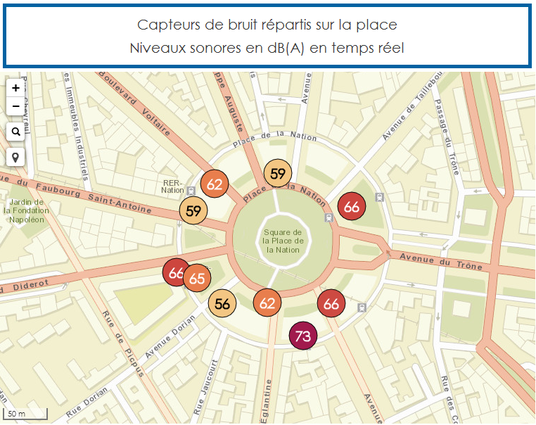 Bruitparif réalise la mesure du bruit dans le cadre de cette expérimentation. 17 capteurs bruit ont ainsi été fabriqués et déployés par Bruitparif tout autour de la Place de la Nation. Parmi ceux-ci, 4 sont des sonomètres de classe 1 qui ont été couplés à des panneaux d'information pour l’affichage en temps réel des niveaux de bruit et la sensibilisation aux événements particulièrement bruyants qui peuvent être occasionnés par l’usage abusif des avertisseurs sonores ou des 2 roues motorisés dont le pot d’échappement a été modifié.