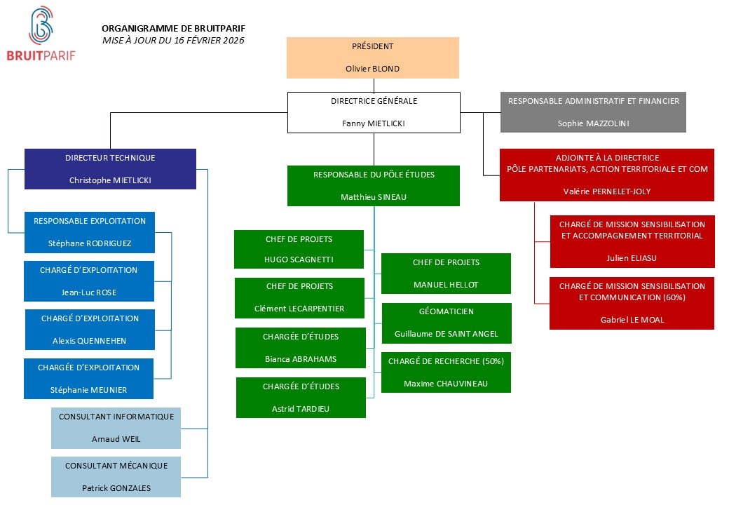L’équipe de Bruitparif est actuellement composée de 18 salariés avec des profils variés et complémentaires : techniciens et ingénieurs en acoustique environnementale, géomaticiens, spécialistes des questions de santé environnementale, chargés de sensibilisation et de communication, techniciens d’exploitation, ingénieurs en technologies et systèmes d’information, responsable administratif et financier. L’équipe est également renforcée par deux consultants extérieurs qui apportent leur contribution à l’évolution et à maintenance de nos plateformes web ainsi qu’à la conception mécanique des matériels utilisés pour la mesure du bruit.